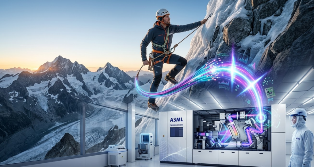 El montañismo de altura implica enfrentarse a condiciones extremas: temperaturas bajo cero, viento y falta de oxígeno. De manera análoga, ASML opera en el «clima extremo» de la física y la ingeniería. Sus máquinas EUV funcionan disparando luz hacia diminutas gotas de estaño a alta velocidad en una cámara de vacío para generar plasma. Es un proceso tan complejo y preciso que a menudo se compara con intentar golpear una pelota de golf en la Luna desde la Tierra. Superar estas condiciones es su día a día.